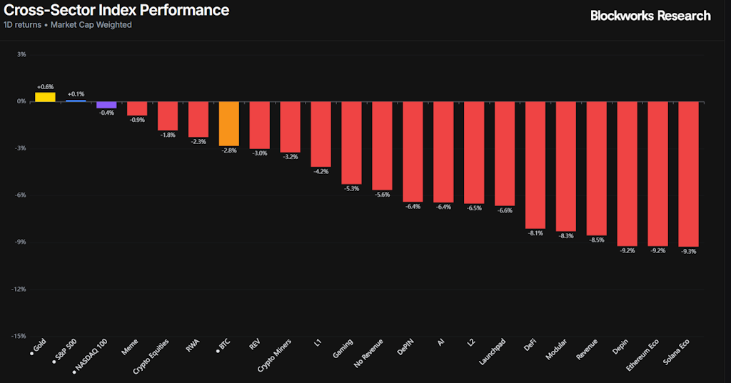 市场避险情绪急剧升温,几乎所有加密货币板块均下跌,而传统资产则保持稳定。黄金(+0.6%)和标普500指数(+0.1%)小幅上涨,与加密货币整体疲软形成鲜明对比,比特币(-2.8%)和更广泛的加密货币股票指数(-1.8%)均出现回落。纳斯达克100指数(-0.4%)反映了科技股市场低迷的情绪,凸显了近期市场波动后投资者温和的避险情绪。
