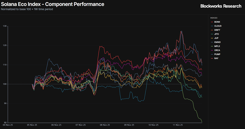 Solana Eco 指数受到 Jito、Drift 和 Metaplex 等关键成分股疲软的拖累。本周初,BONK 和 DRIFT 等成分股的强势表现尤为突出,但随着获利回吐和流动性缩减,周末时势头减弱,DeFi 和相关概念股受到的冲击最大。ORCA 和 RAY 表现相对坚挺,在周低点上方企稳,但最终仍收跌。各协议间的巨大分化凸显出资金正从高 beta 值的 SOL DeFi 代币转向流动性中心和收益平台。