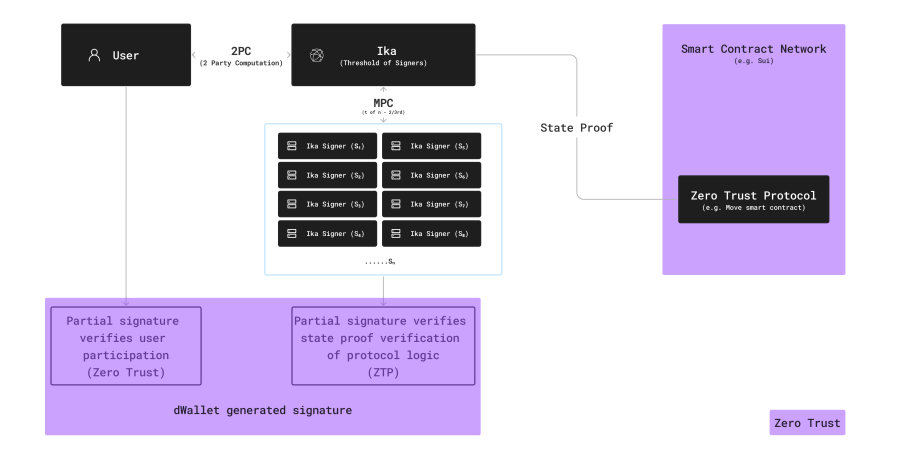 该协议采用新颖的2PC-MPC架构,使分布式网络能够生成具有密码学保证且需要用户参与的签名,从而解决了现有阈值签名方案的一个关键局限性。虽然Lit Protocol、NEAR和ICP等竞争对手提供的阈值签名由授权验证器集控制,但Ika可以确保任何交易都必须经过用户的明确授权才能执行,从而消除因验证器被盗用或员工恶意操作而带来的风险。