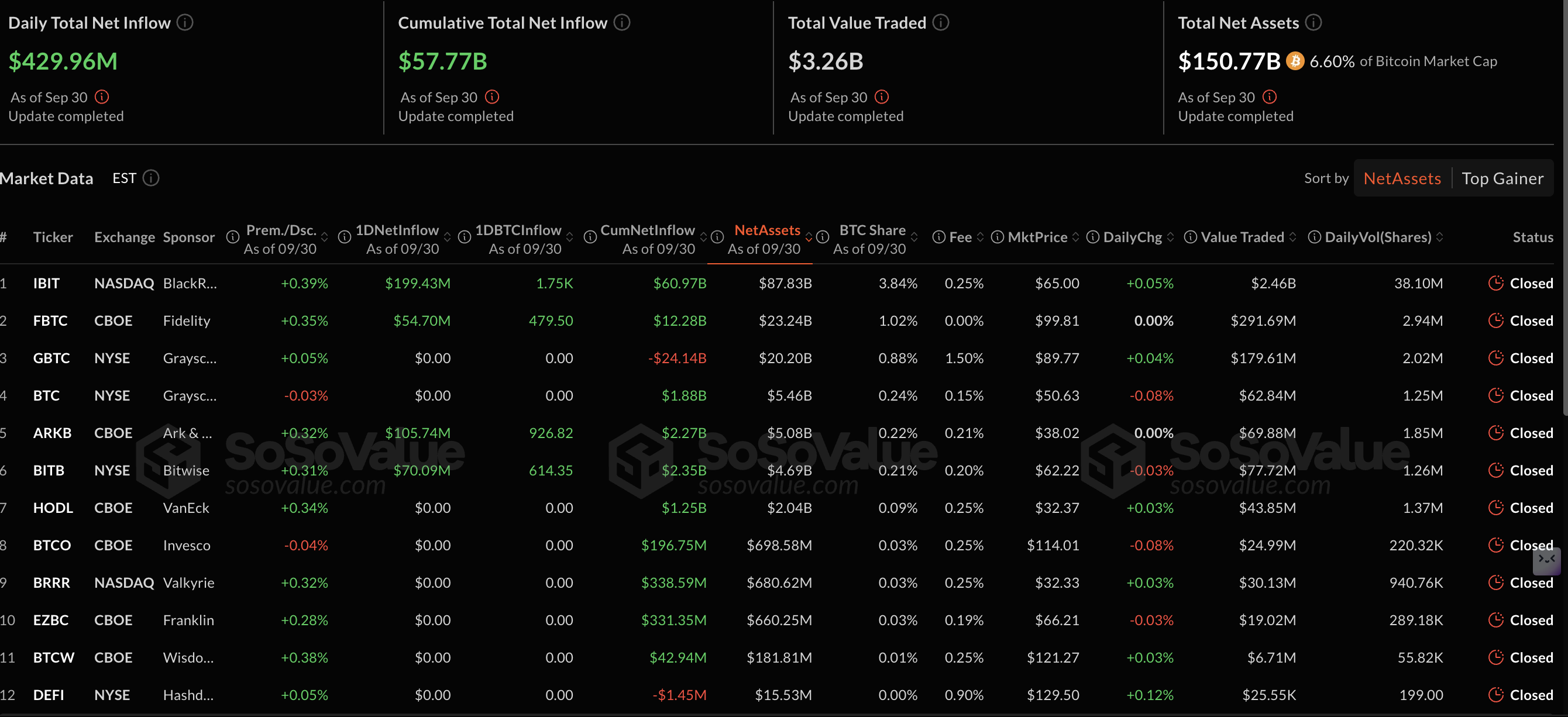 在现货交易所交易基金 (ETF) 方面,随着价格在 9 月份回调至 107,000 美元附近后回升,机构投资者正在加倍努力。