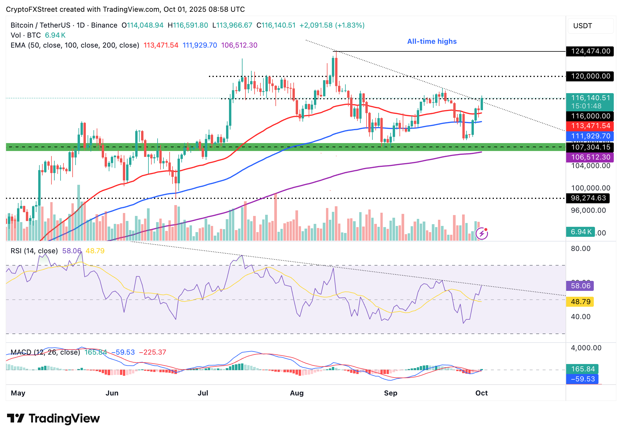 比特币(BTC)10月开局强劲,周三价格突破116,000美元。尽管市场普遍预期9月通常是看跌的月份,但加密货币,BTC上涨5.31%。