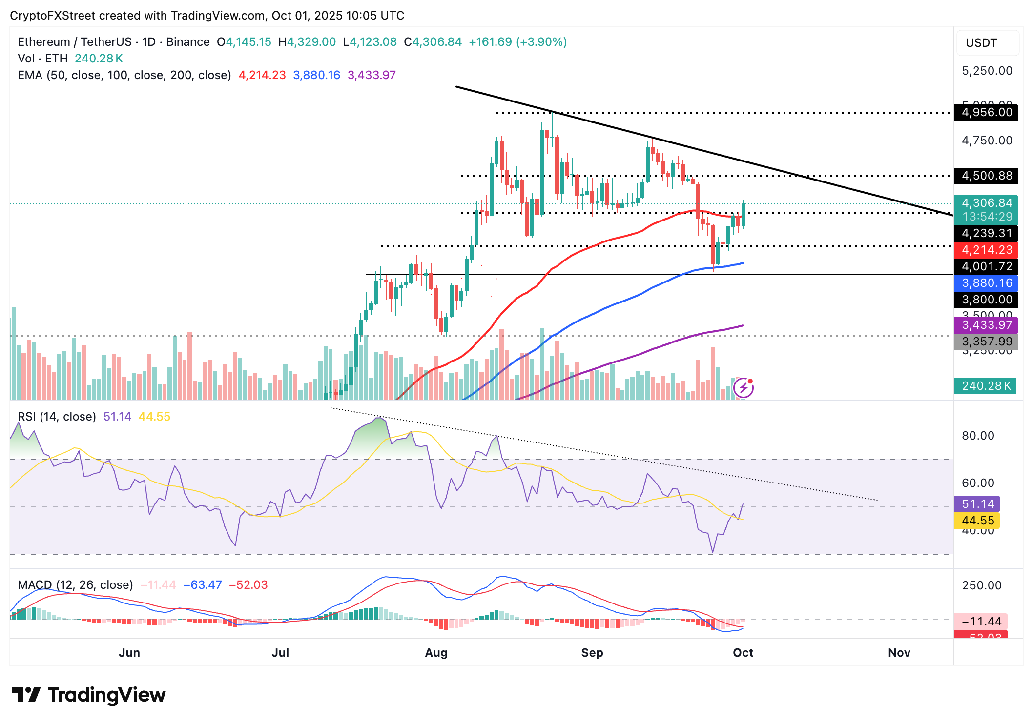 - 由于稳定的 ETF 流入支持看涨前景,以太坊维持在 4,300 美元以上。