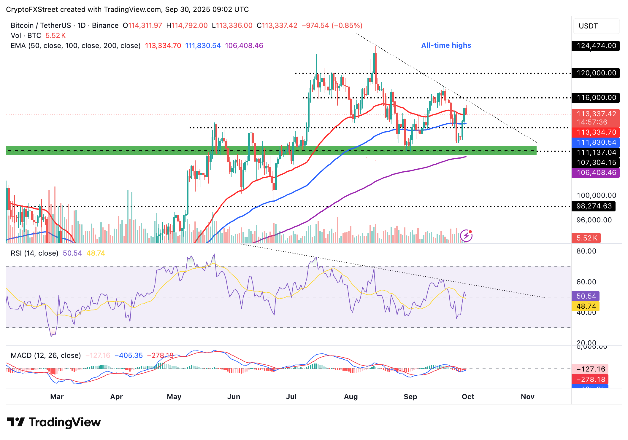 比特币多头正努力将价格维持在50日指数移动平均线(EMA)附近,目前日线图上的价格为113,337美元。周一的反弹未能维持在114,000美元上方,表明短期获利了结。相对强弱指数(RSI)在前一天达到53的峰值后,目前处于中性区域,看涨势头正在消退。