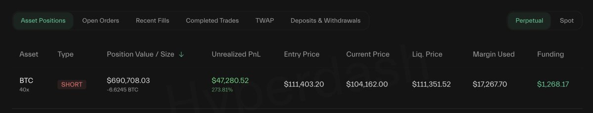衍生品交易平台 Hyperliquid 的交易记录显示,Wynn 的 BTC/USD 空头头寸盈利约 5 万美元。