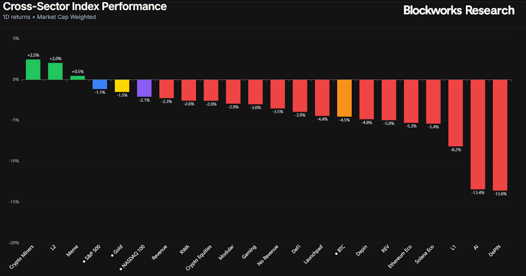市场避险情绪急剧升温,加密货币板块全面遭到抛售,而传统资产则相对坚挺。比特币(-4.5%)领跌,纳斯达克100指数(-2.1%)和标普500指数(-1.1%)也小幅下跌。黄金(-1.5%)也出现回落,此前受美国国债收益率上升和美元走强的影响,避险需求有所减弱。