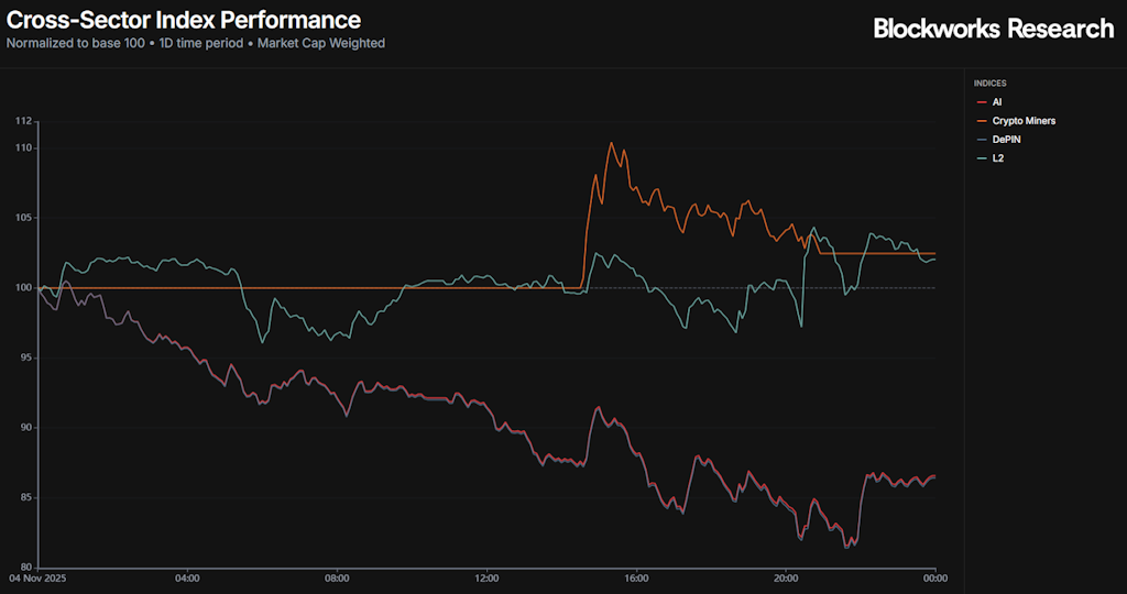加密货币板块表现分化严重。矿工(+2.5%)和二级支付(+2.0%)是仅有的亮点,这得益于市场对扩容和即将进行的费用结构升级的乐观情绪重燃。与之形成鲜明对比的是,人工智能(-13.4%)和DePIN(-13.6%)表现最差,抹去了近期的投机涨幅。以太坊(-5.3%)和Solana(-8.2%)生态系统也表现不佳,流动性从高贝塔系数的代币中流出。Launchpad(-4.4%)和DeFi(-3.9%)继续走低,反映出链上活动减弱以及对上周上涨行情的获利回吐。