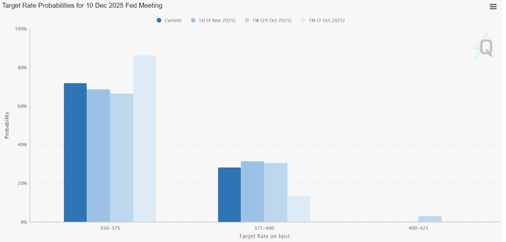 此次抛售潮源于交易员在关键宏观经济催化剂(尤其是周五的美国非农就业报告和美联储持续暗示“高利率将持续更长时间”的言论)公布前重新评估风险敞口。如下所示,降息25个基点的概率已从80%以上降至70%。小市值加密货币的急剧下跌表明流动性趋于紧张,主要加密货币的仓位也趋于收紧。