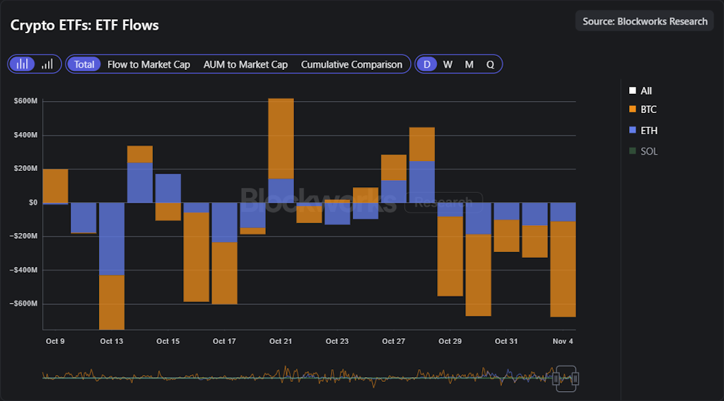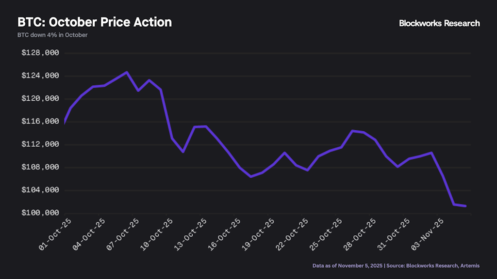本周比特币价格的快速回落和ETF资金流动的下滑表明,机构加密货币投资者的策略已从积累转向谨慎。11月4日至5日,比特币价格在10月初突破12.6万美元后,回落至10万美元附近,跌幅超过15%至20%。