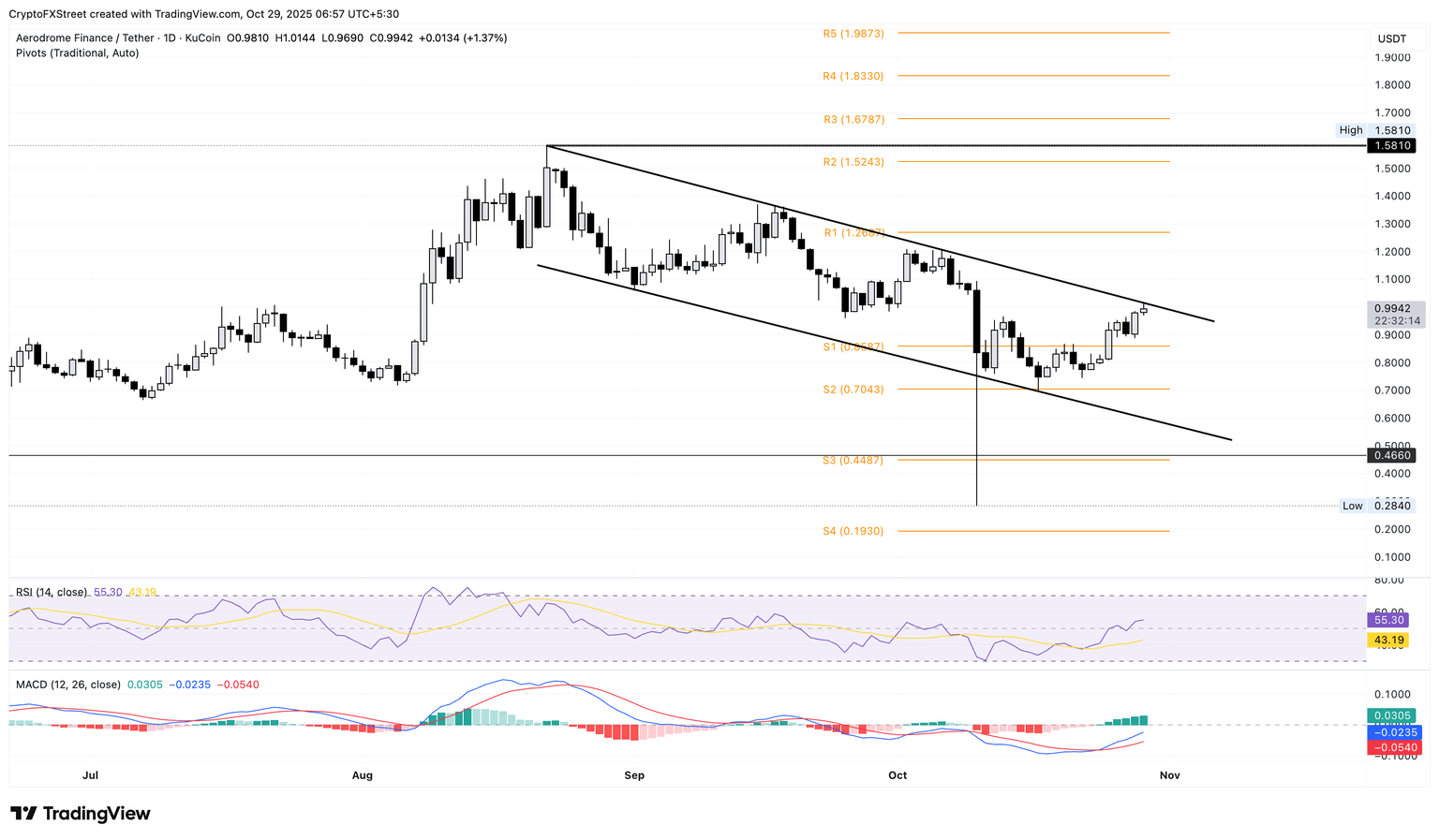 截至本文撰写时,AERO 周三亚洲交易时段上涨 1%,延续了前一日 8% 的涨幅。反弹势头逼近 1 美元的心理关口和上方阻力趋势线,并在日线图上完成了下跌通道形态。