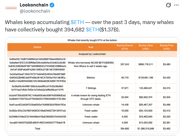 Lookonchain 分享的数据显示,巨鲸们总共购买了 394,682 个 ETH,价值约 1,366,515,846 美元,平均每个 ETH 的价格为 3,462 美元。