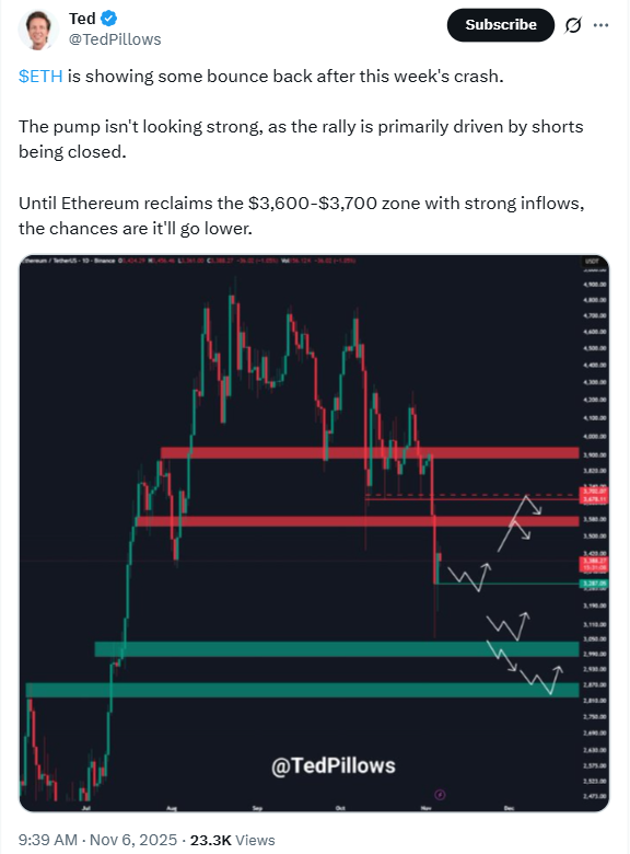 他解释说,以太坊价格需要重新回到 3600 美元至 3700 美元区间上方,并有稳定的资金流入,真正的复苏才能形成。