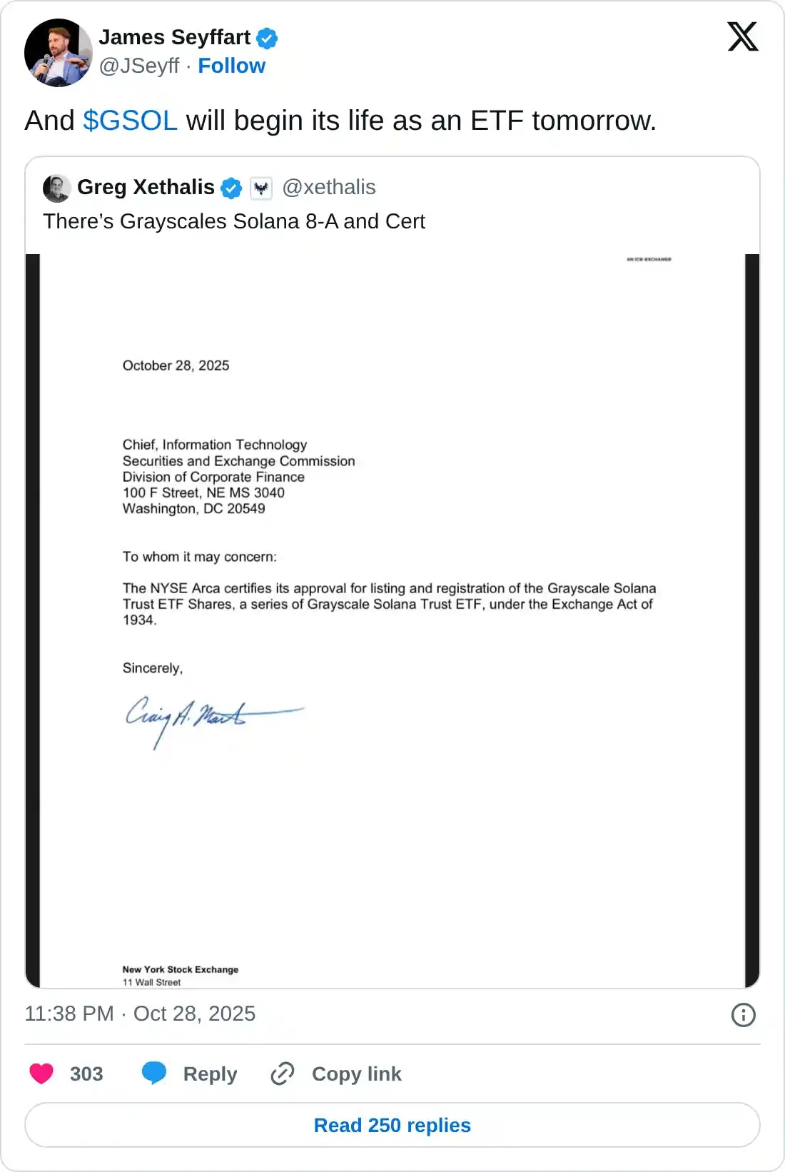 另一方面,美国证券交易委员会(SEC)于周三美股交易时段批准了Grayscale Solana Trust ETF(GSOL)的上市。截至周三(亚洲交易时段),该信托持有525,387个SOL,价值近1.02亿美元。