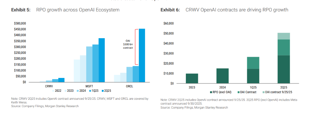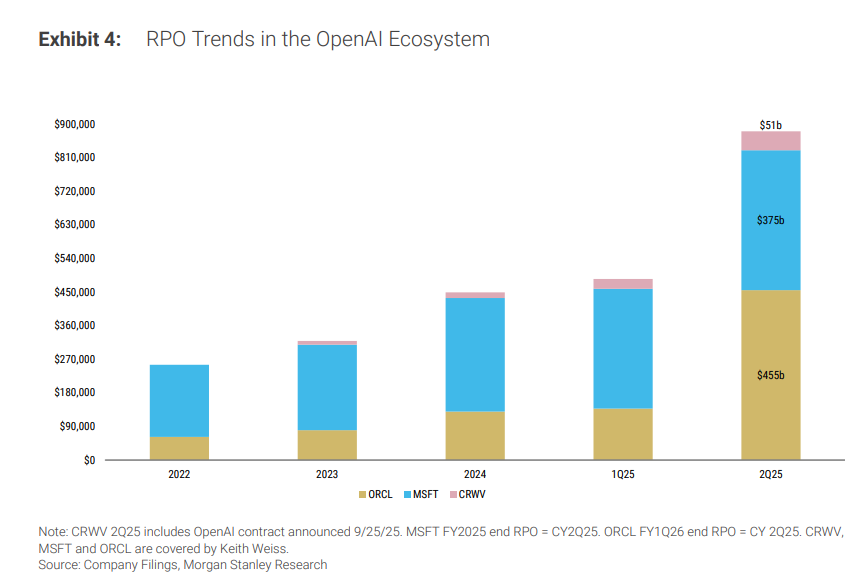 报告指出,OpenAI的合同约占甲骨文剩余履约义务(RPO)总额的三分之二,以及云服务商CoreWeaveRPO的约40%。据大摩估计,OpenAI的合同总计推动了微软、甲骨文和CoreWeave三家公司RPO的显著增长,使其在三家公司总计约8800亿美元的RPO中占据了超过3300亿美元的份额。