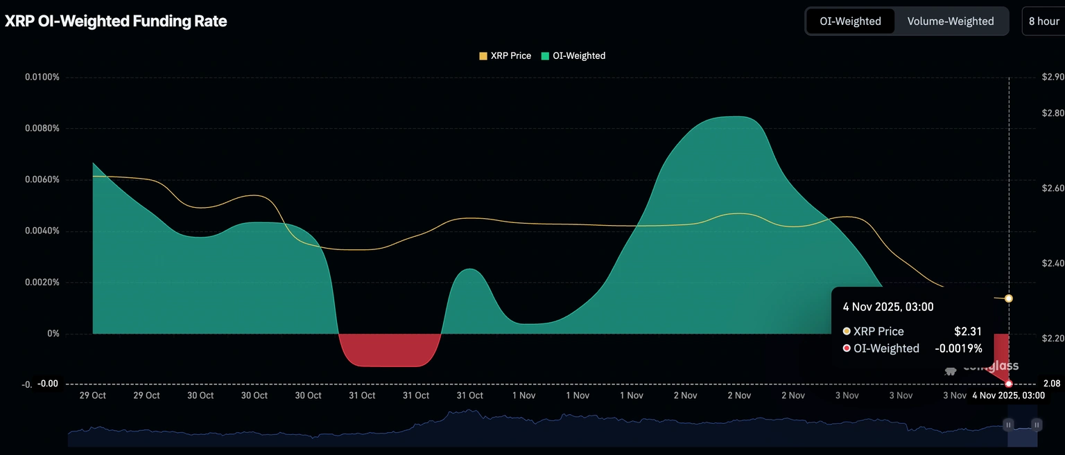 CoinGlass数据显示,未平仓合约加权资金费率为-0.0019%,低于周日的0.0085%。这一急剧下降表明交易员正在有意平仓多头头寸并大量买入空头头寸,从而使XRP失去了维持其复苏所需的利好因素。