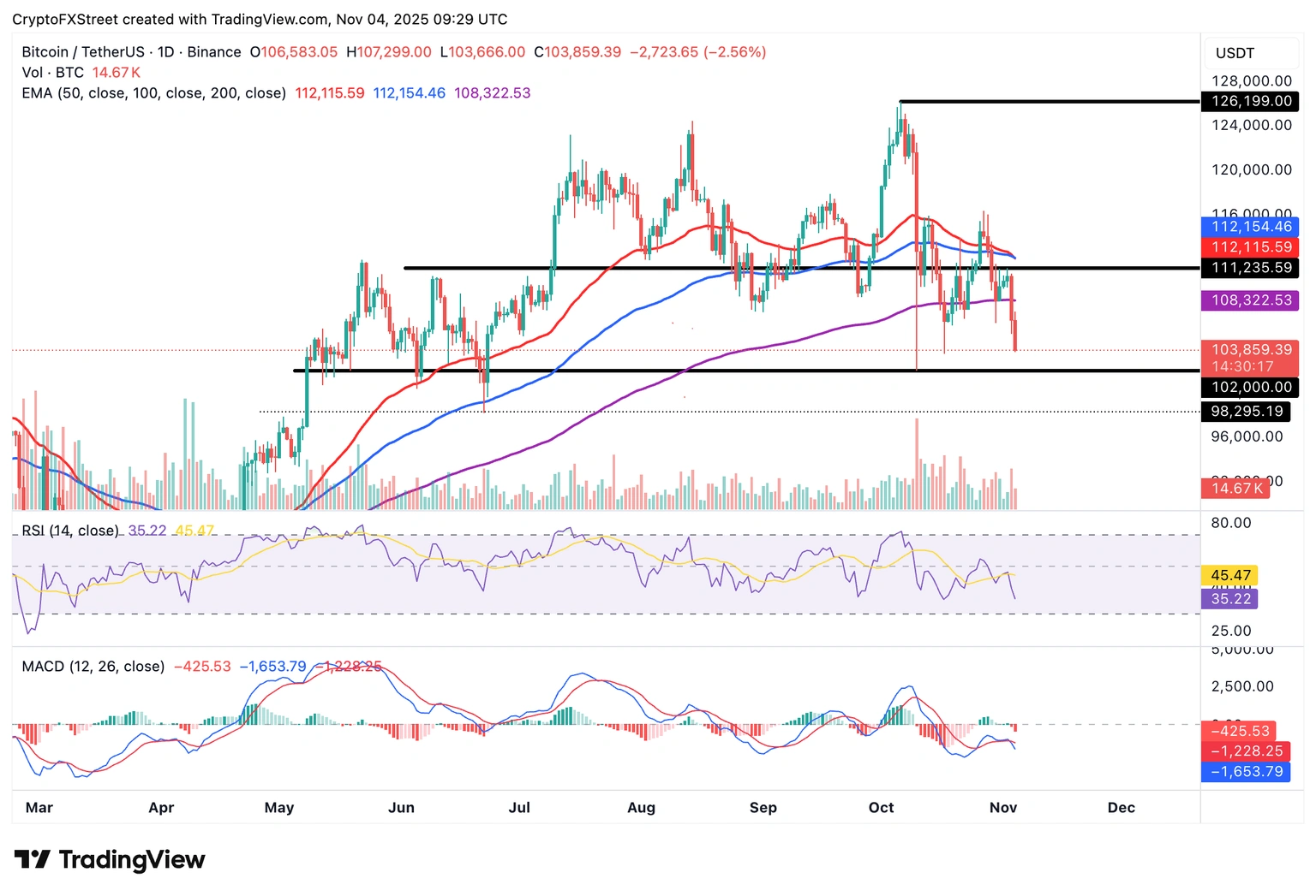 比特币(BTC)连续第二天下跌,反映出整体市场避险情绪持续高涨。加密货币截至周二发稿时,该股交易价格低于 104,000 美元,阻力最小的下跌方向似乎是下行,目标价位是 10 月份的低点 102,000 美元。