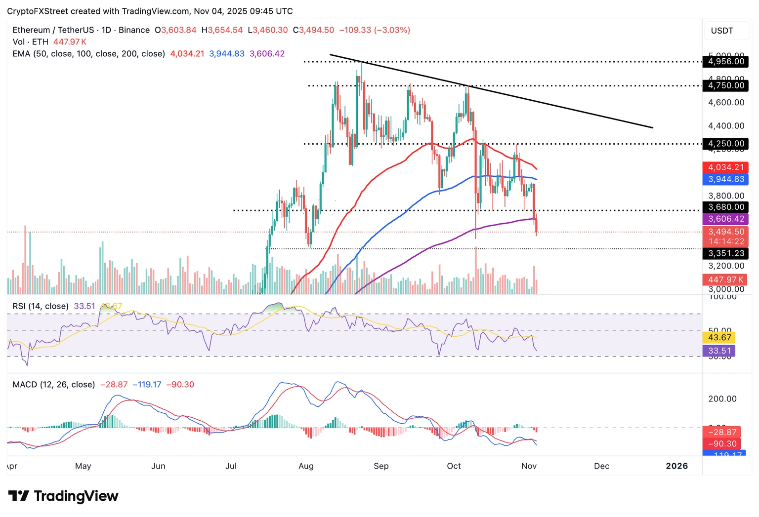 截至周二发稿时,以太坊交易价格跌破 3500 美元,步比特币后尘,走低行情。这种智能合约代币目前低于关键移动平均线,包括 200 日指数移动平均线 (EMA) 3606 美元、100 日 EMA 3944 美元和 50 日 EMA 4034 美元,这些均强化了看跌情绪。