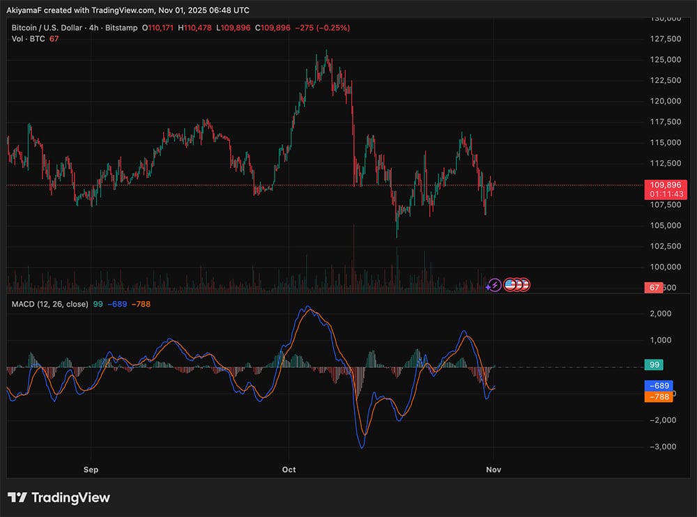 技术图表显示,比特币价格可能已在 106,000 美元附近触底。相对强弱指数 (RSI) 短暂跌至 45 后反弹,这是典型的超卖反转信号。此外,移动平均收敛/发散指标 (MACD) 刚刚上穿金叉,与 2020 年和 2023 年引发大幅上涨的形态如出一辙。关注今日加密货币新闻趋势的分析师认为,一旦成交量回升,比特币价格有望冲击 120,000 美元。