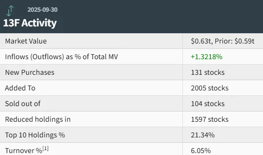 统计数据显示,景顺第三季度持仓总市值达6300亿美元,上一季度总市值为5900亿美元。景顺在第三季度的持仓组合中新增了131只个股,增持了2005只个股;同时,景顺减持1597只个股,清仓104只个股。其中,景顺的前十大持仓标的占总市值的21.34%。