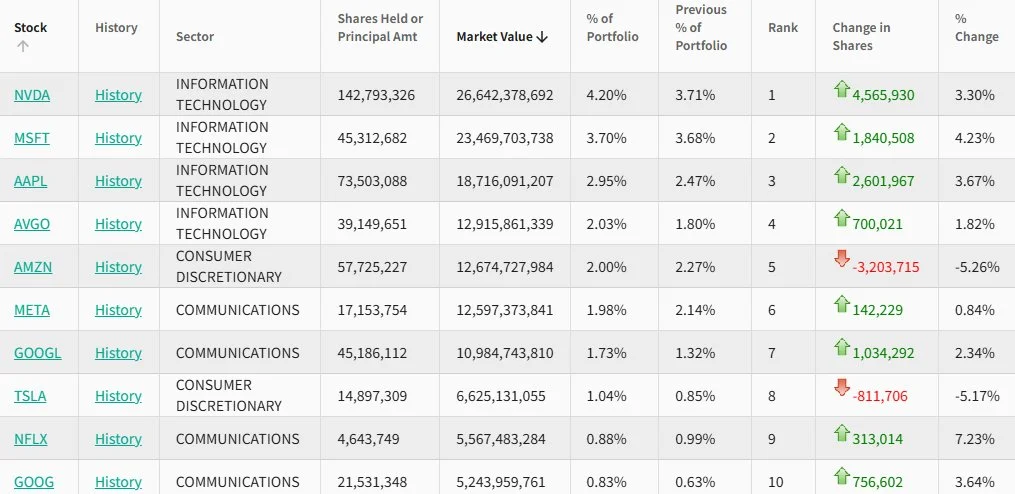$博通 (AVGO.US)$ 位列第四,持仓约3914.97万股,持仓市值约为129.16亿美元,占投资组合比例为2.03%,较上季度持仓数量增加1.82%。