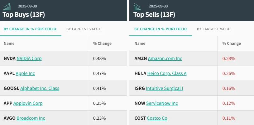 前五大卖出标的分别是:亚马逊、 $海科航空 (HEI.US)$ 、 $直觉外科公司 (ISRG.US)$ 、 $ServiceNow (NOW.US)$ 、 $好市多 (COST.US)$ 。