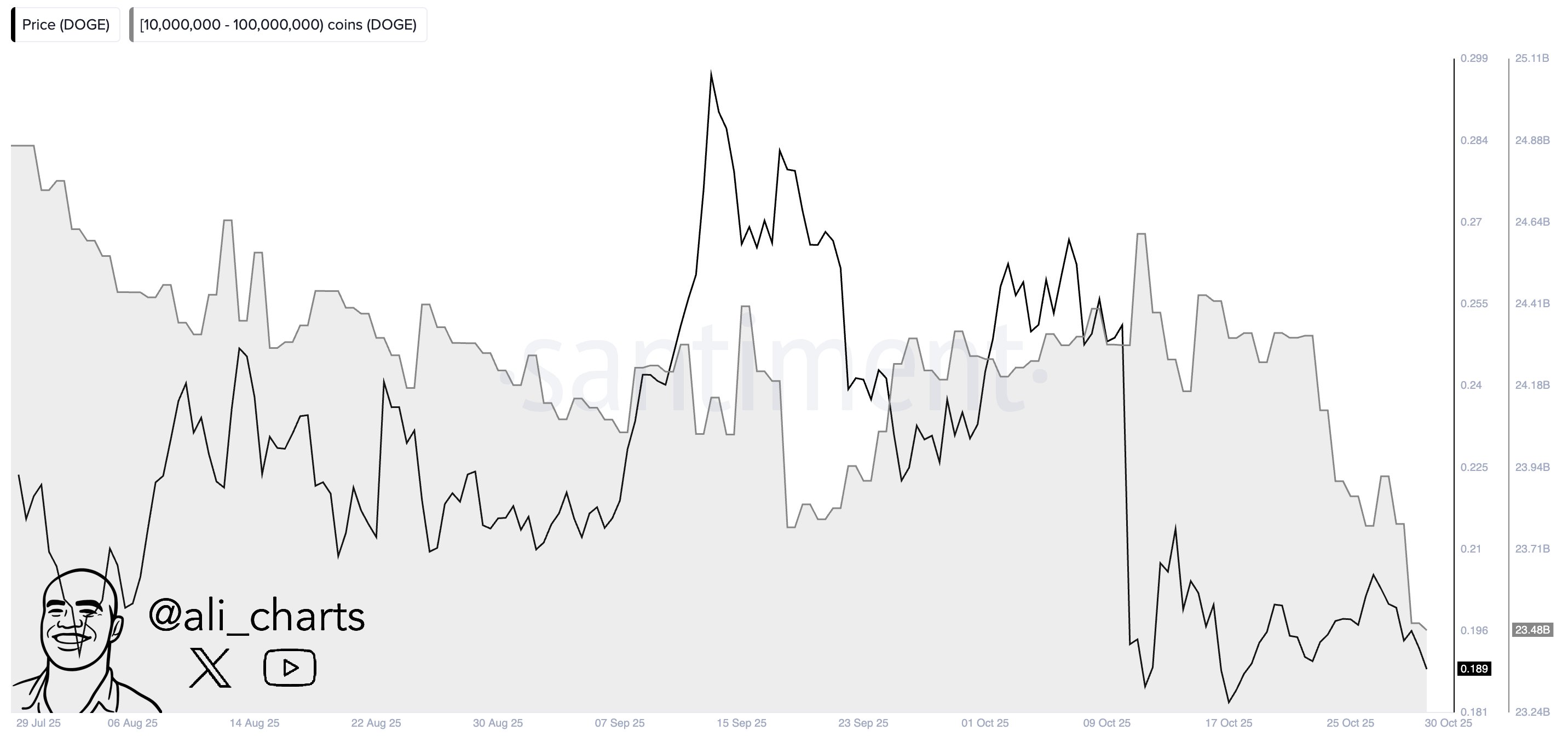 正如分析师阿里·马丁内斯在一篇新文章中指出的那样邮政在 X 平台上,巨鲸们在过去几天减少了他们持有的狗狗币数量。分析师引用的指标是“供应配送”来自链上分析公司 Santiment,它告诉我们属于特定币种范围的投资者总共持有多少 DOGE。