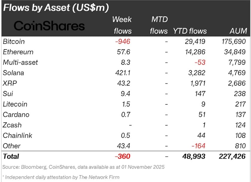 CoinShares 数据数据显示,SOL每周吸引资金流入4.211亿美元(在所有资产中最高),而比特币 [BTC]9.46 亿美元资金流出市场,使比特币成为总资金流出量的主要驱动因素。