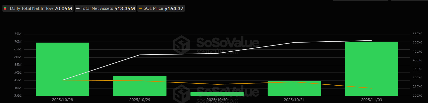 最新数据显示,Solana ETF 的资金流入在过去一周一直保持强劲势头,其中两次出现明显的峰值,每次约为 7000 万美元。这使得ETF的总净资产超过了5亿美元。但价格走势却没有随之改变。