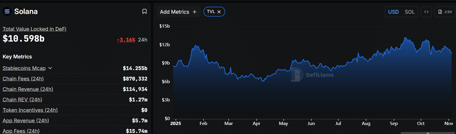 与此同时,DeFiLlama数据显示,Solana的总锁定价值(TVL)为105.9亿美元,24小时内下降了约3%。因此,或许资金正通过ETF更快地流入,而链上市场却无法及时反映。