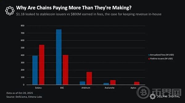 以 Solana、BSC、Arbitrum、Avalanche、Aptos 为例,Circle 与 Tether 每年获得约 11 亿美元收益,而这些生态仅赚取 8 亿美元交易费。