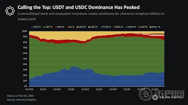 Tether 与 Circle 的护城河正在被侵蚀:分发渠道胜过网络效应。Tether 和 Circle 所占据的稳定币市场份额,可能已经在相对意义上触顶——即便稳定币的总体供应量仍在持续增长。预计到 2027 年,稳定币的总市值将突破 1 万亿美元,但这一扩张的收益不会像上一个周期那样主要流向既有巨头。相反,越来越多的份额将流向「生态原生稳定币」与「白标发行(white label issuance)」策略,因为区块链和应用开始将收益与分发渠道「内生化」。
