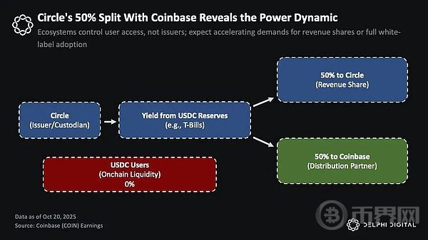 Coinbase 从 Circle 的 USDC 储备收益中获取 50%,并独占平台上持有的 USDC 收益。