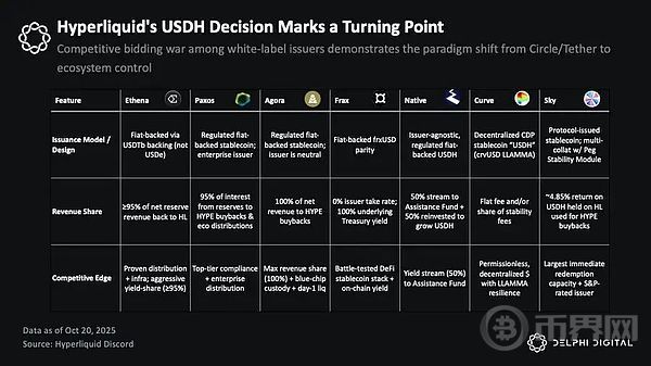 在 USDH 的竞标过程中,几乎所有主要的白标稳定币发行方都参与其中,包括 Native Markets、Paxos、Frax、Agora、MakerDAO(Sky)、Curve Finance 以及 Ethena Labs。这是稳定币经济在应用层的首次大规模竞争,标志着“分发权”的价值正被重新定义。