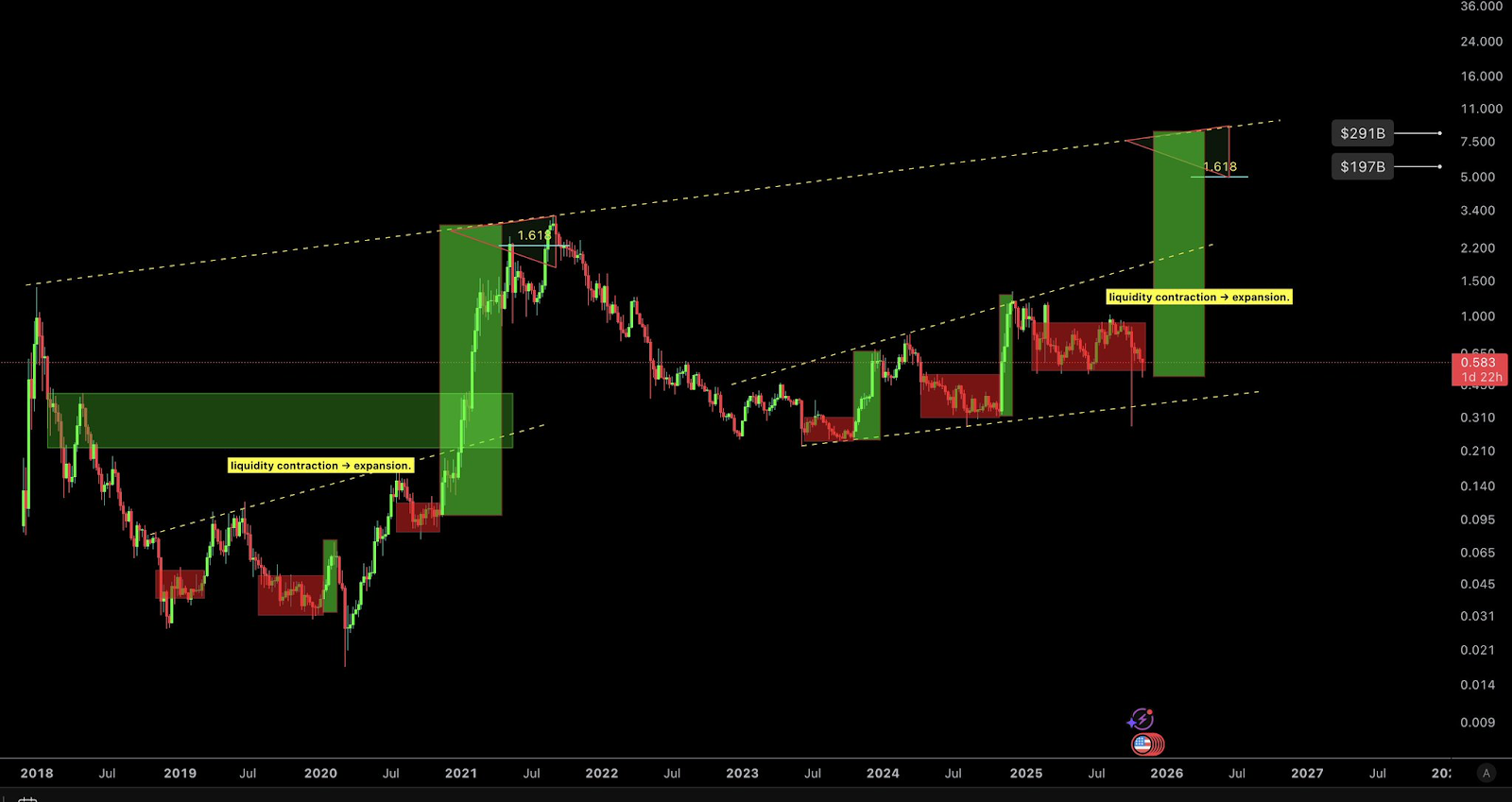 Cardano 的价格已重新测试并从 0.55 美元附近的支撑位反弹。自 2024 年以来,该区域一直扮演着关键支撑的角色,尽管价格偶尔会跌破该区域后又反弹。因此,如果 ADA 价格在未来几周内继续保持在当前流动性水平之上,那么关于其价格即将迎来抛物线式上涨的说法将得到证实。