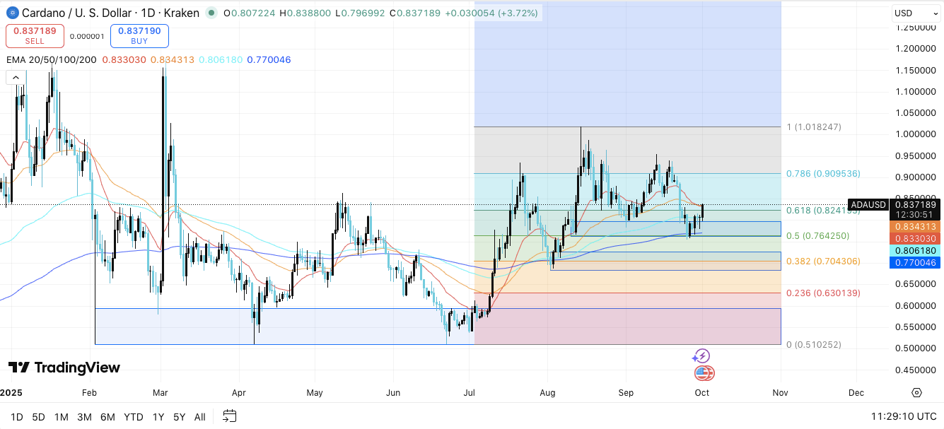 卡尔达诺 (ADA) 价格重回 0.83 美元上方,在经历了动荡的回调后,再次激发了市场乐观情绪。近期的反弹不仅吸引了投资者对 ADA 技术结构的关注,也使其不断增长的衍生品市场备受关注。