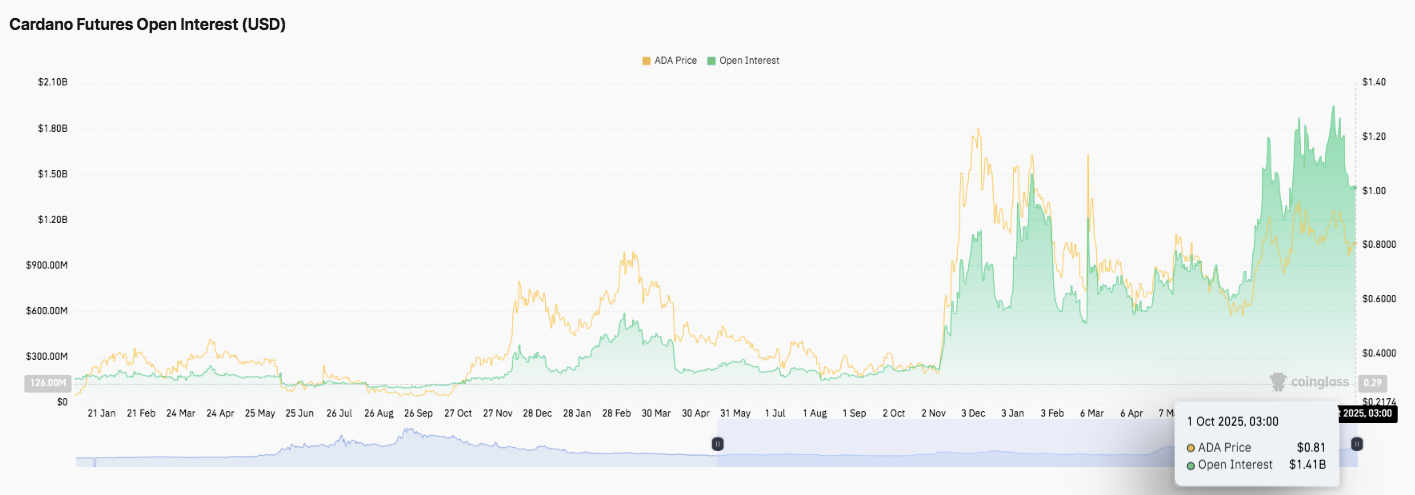 除了图表水平之外,衍生品活动也提供了宝贵的洞察。Cardano 的期货未平仓合约从今年早些时候的不到 3 亿美元飙升至 10 月份的 14.1 亿美元。这种稳步增长反映出参与度的提升和新增多头仓位,而非空头平仓。