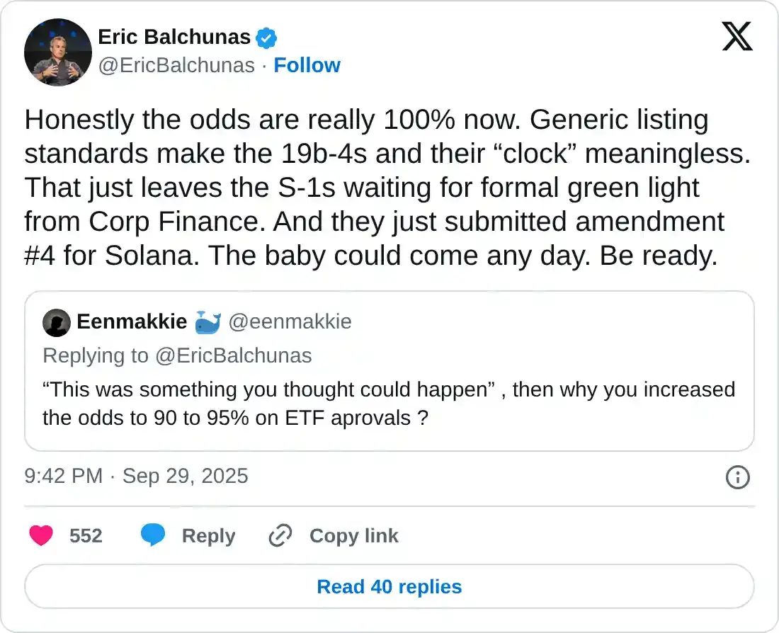彭博社高级 ETF 分析师 Eric Balchunas 周二表示,“老实说,现在的可能性真的是 100%。”