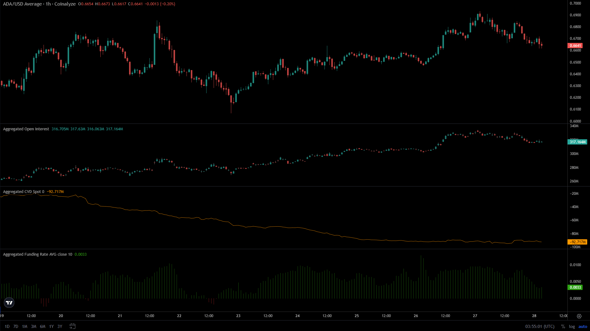 卡尔达诺[ADA]该股一度略高于0.61澳元的本地支撑位。随后,该股在四天内反弹11.4%,攀升至0.694澳元。然而,在过去24小时内,该股在图表上回落了4%。