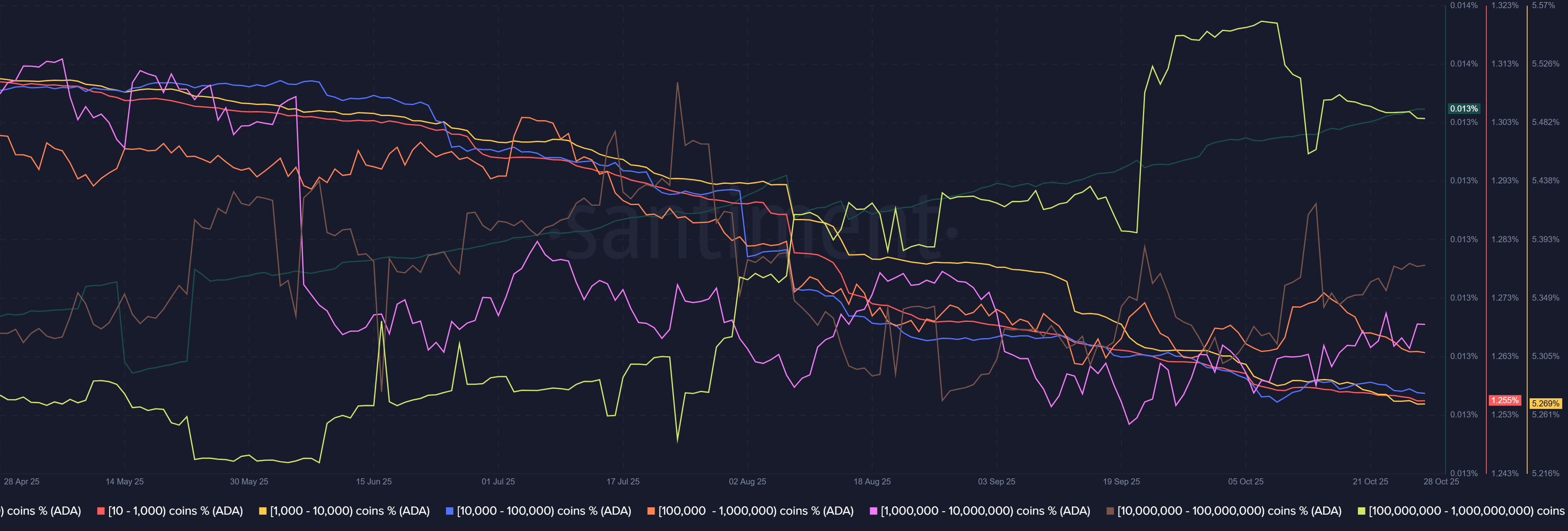 与短期的矛盾情绪形成鲜明对比的是,近期规模较大的 Cardano 钱包持续增持 ADA。证据是,持有 10 万或更多 ADA 代币的钱包在 ADA 供应量中所占比例不断上升。