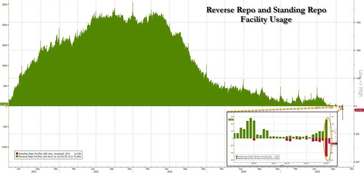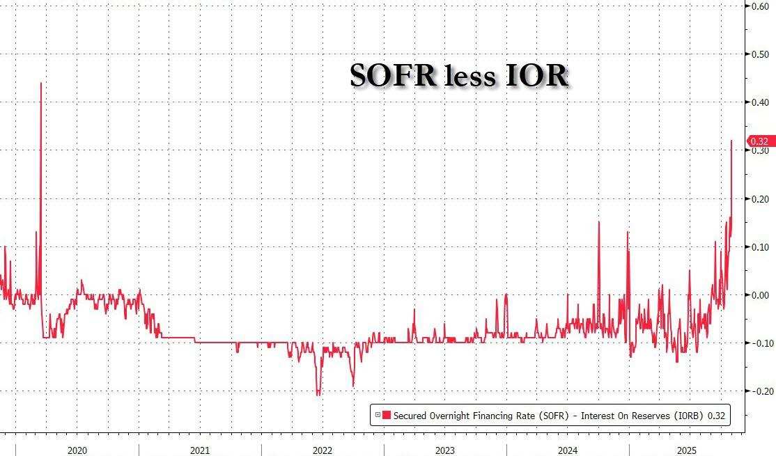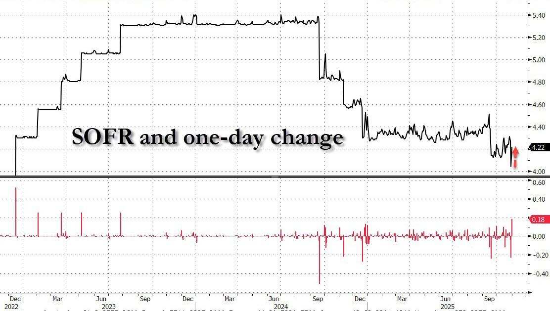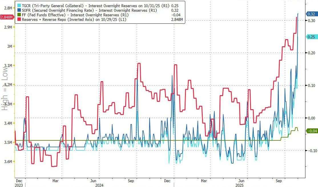 更糟的是:要了解上周五美国资金市场究竟有多紧,只需看看有担保隔夜融资利率(SOFR)可能就够了——10月31日该利率飙升18个基点至4.22%。按理说,考虑到上周美联储已再度降息,该利率理应维持在4.00%左右,但现实却是仿佛美联储从未降息过……