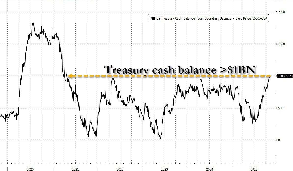 这当然也将人们引向一个结论:由于政府停摆起到了实际上的“加息”作用,从市场抽走了超过7000亿美元的流动性,当前现状(政府停摆)的逆转,可能也将导致新的资金涌入市场,因为财政部将不再受特殊的政府停摆会计规则约束,并将从美联储的财政账户向更广泛的经济释放数千亿现金。