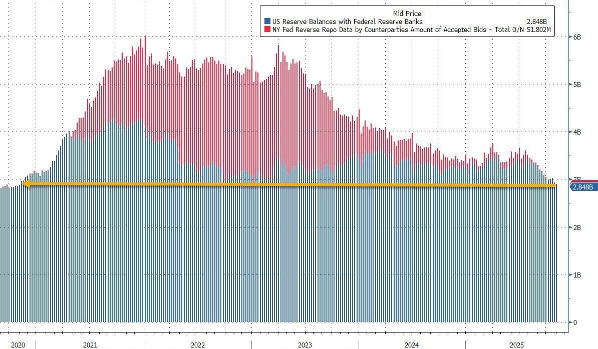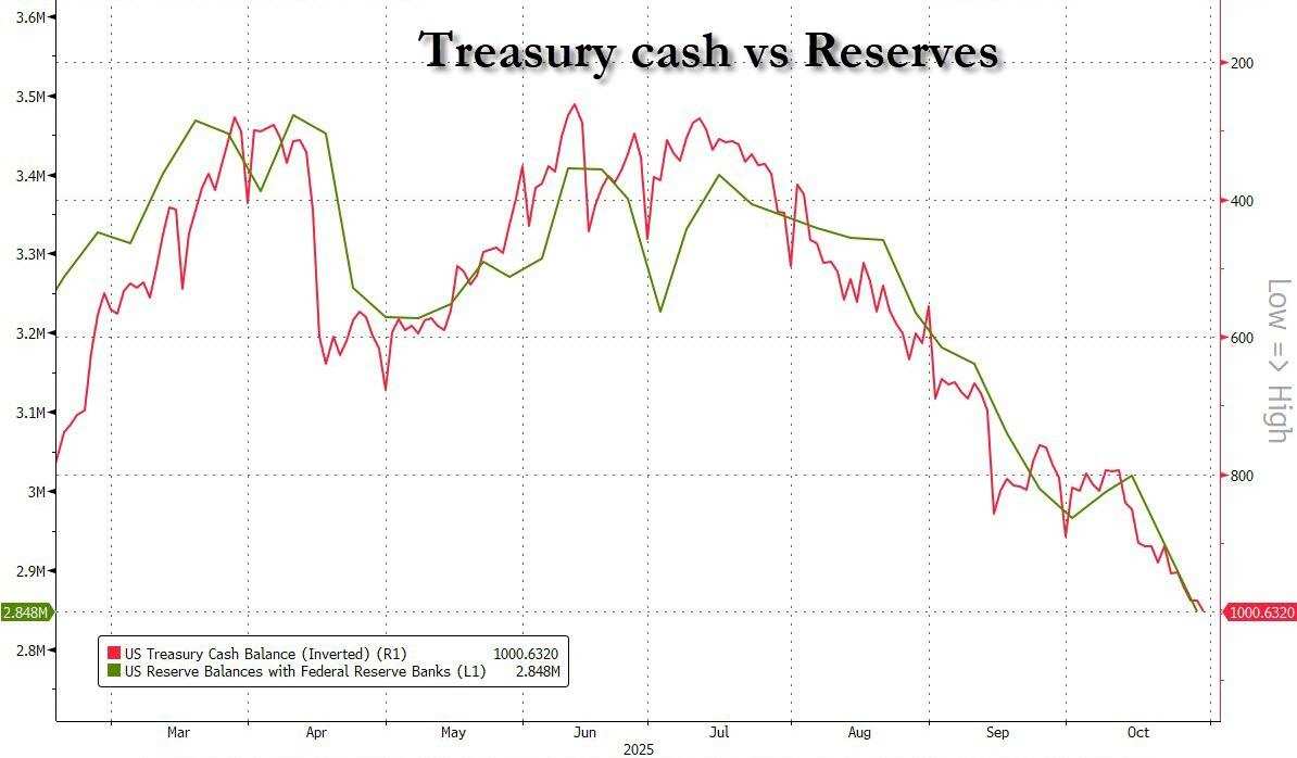 由于美国政府持续停摆迫使财政部吸纳所有可用资金,其直接后果是美联储负债端的银行准备金暴跌——目前已跌至仅2.85万亿美元,为2021年初以来的最低水平……