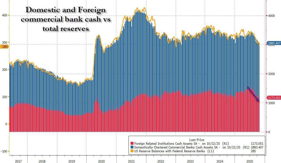 而与此同时,外国商业银行的现金资产急剧下降(如美联储H.8报告所示),其峰值在7月刚超过1.5万亿美元,此后已下跌逾3000亿美元至1.173万亿美元。换言之,政府停摆的最大受害者,以及融资条件急剧收紧的主要原因,似乎就是外国银行持有的现金——该项在过去4个月内急剧下降,并在政府停摆期间被财政部实际征用以支付日常开支。