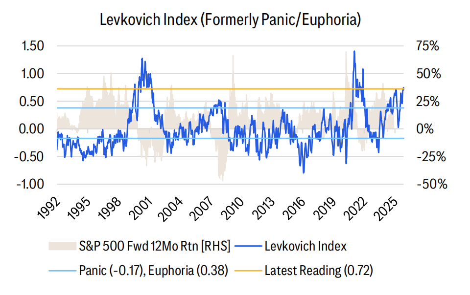 用来衡量市场情绪的花旗莱斯科维奇恐慌与亢奋指数(Levkovich Index)目前读数为0.72,显著高于0.38的“亢奋”标准。报告的历史回测数据显示,当该指数进入亢奋区域时,标普500指数接下来一年的回报中位数通常为负值(-9.4%)。