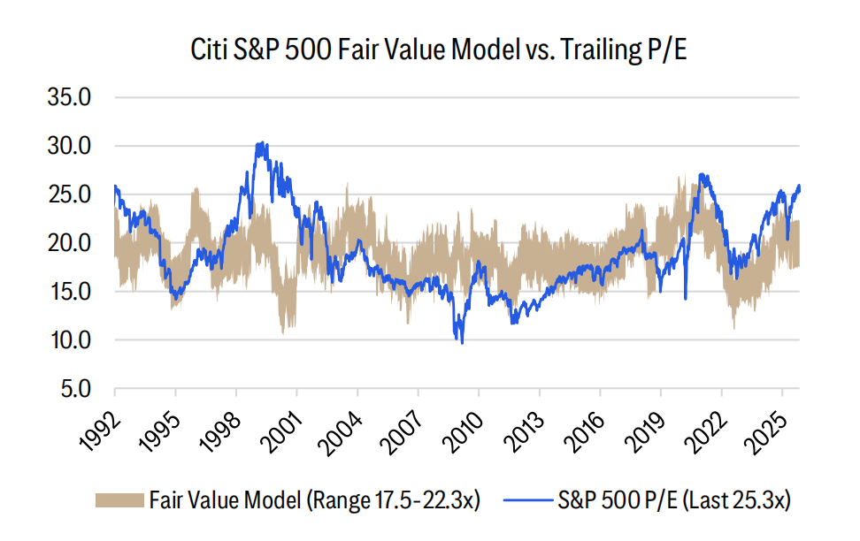 估值高企是另一个引发担忧的关键因素。花旗的PULSE模型将“价格”指标评为“负面”,多项估值指标已接近历史极值。报告数据显示,当前美股估值已处于历史高位。标普500指数的市盈率(TTM P/E)已达到25.3倍,位于过去40年历史数据的第95个百分位,这意味着该估值比过去40年95%的时候都高。