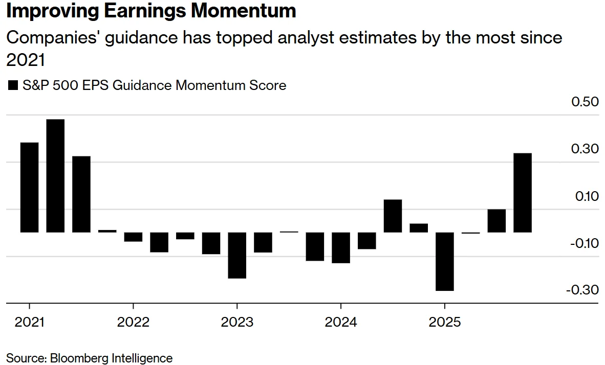 数据显示,在第三季度利润增长15%之后,利润指引动能(即上调盈利预期的标普500成分公司数量与维持或下调预期公司数量的比例)已升至2021年以来的最高水平。