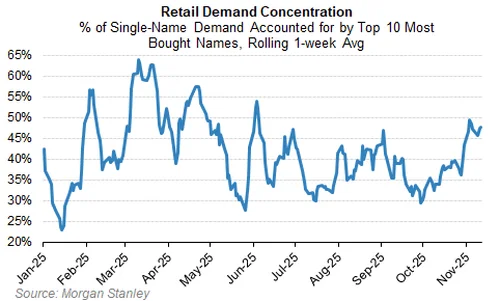散户资金的流向变化,正成为影响市场结构的关键因素。数据显示,虽然散户资金流入速度仍远高于过去一年的平均水平,但资金正变得越来越集中。过去一周,近一半的散户个股买盘都集中在前十大公司,主要是英伟达(NVDA)、特斯拉(TSLA)、PLTR和META等大型科技股。