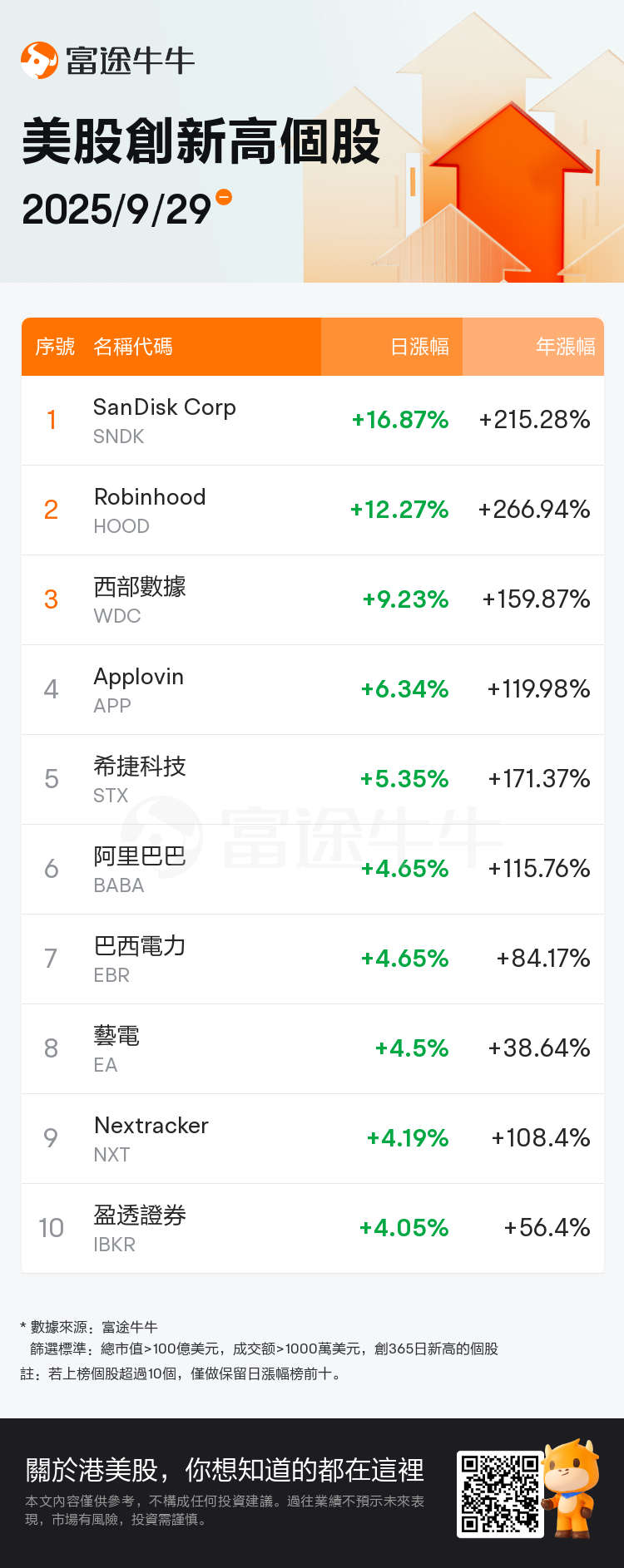 存储概念超级牛股再创新高!隔夜 $SanDisk Corp (SNDK.US)$ 涨近17%、 $西部数据 (WDC.US)$ 涨超9%、$希捷科技 (STX.US)$ 涨超5%