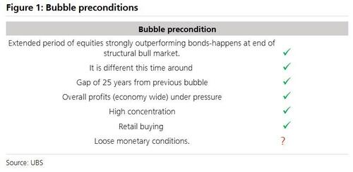 尽管泡沫的条件正逐步具备,但瑞银认为,市场距离真正的泡沫顶峰还有相当距离。报告从估值、长期催化剂和短期催化剂三个维度,分析了标志市场见顶的关键信号。