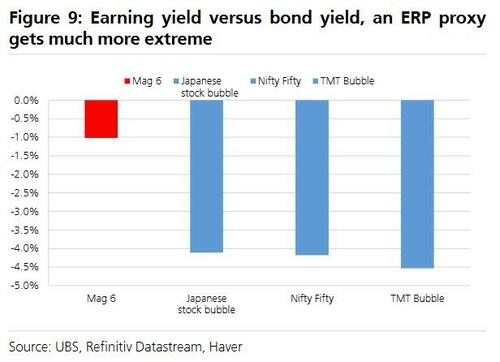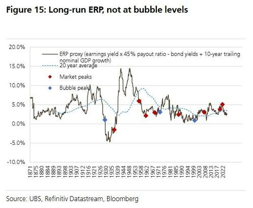 1、明确的估值过高:历史上的泡沫顶峰通常伴随极端估值。例如,在之前泡沫中,至少30%市值的公司市盈率会升至45倍至73倍,而目前“科技七巨头”(Mag 6)的动态市盈率为35倍。同时,股权风险溢价(ERP)也未降至2000年或1929年时约1%的极端低位。