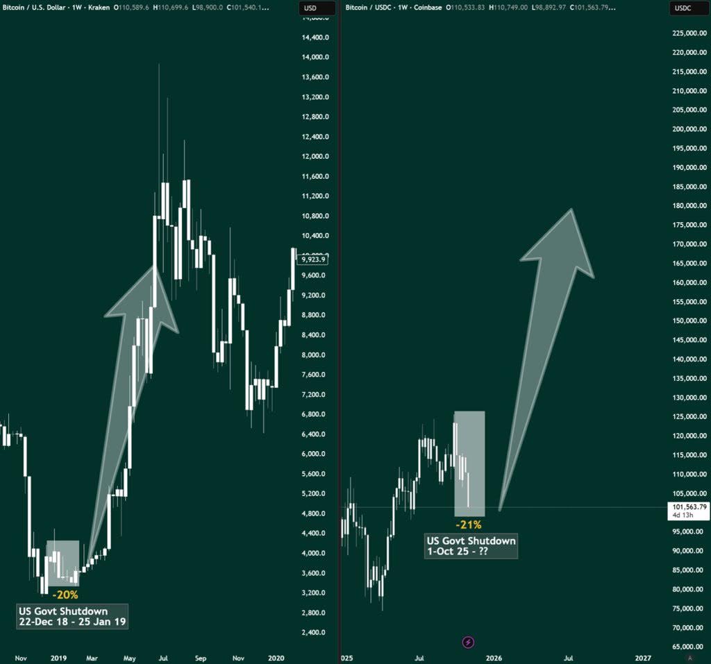 图表显示,价格回调约21%至支撑位。一个较大的向上箭头暗示,一旦美国政府停摆结束,价格可能反弹。